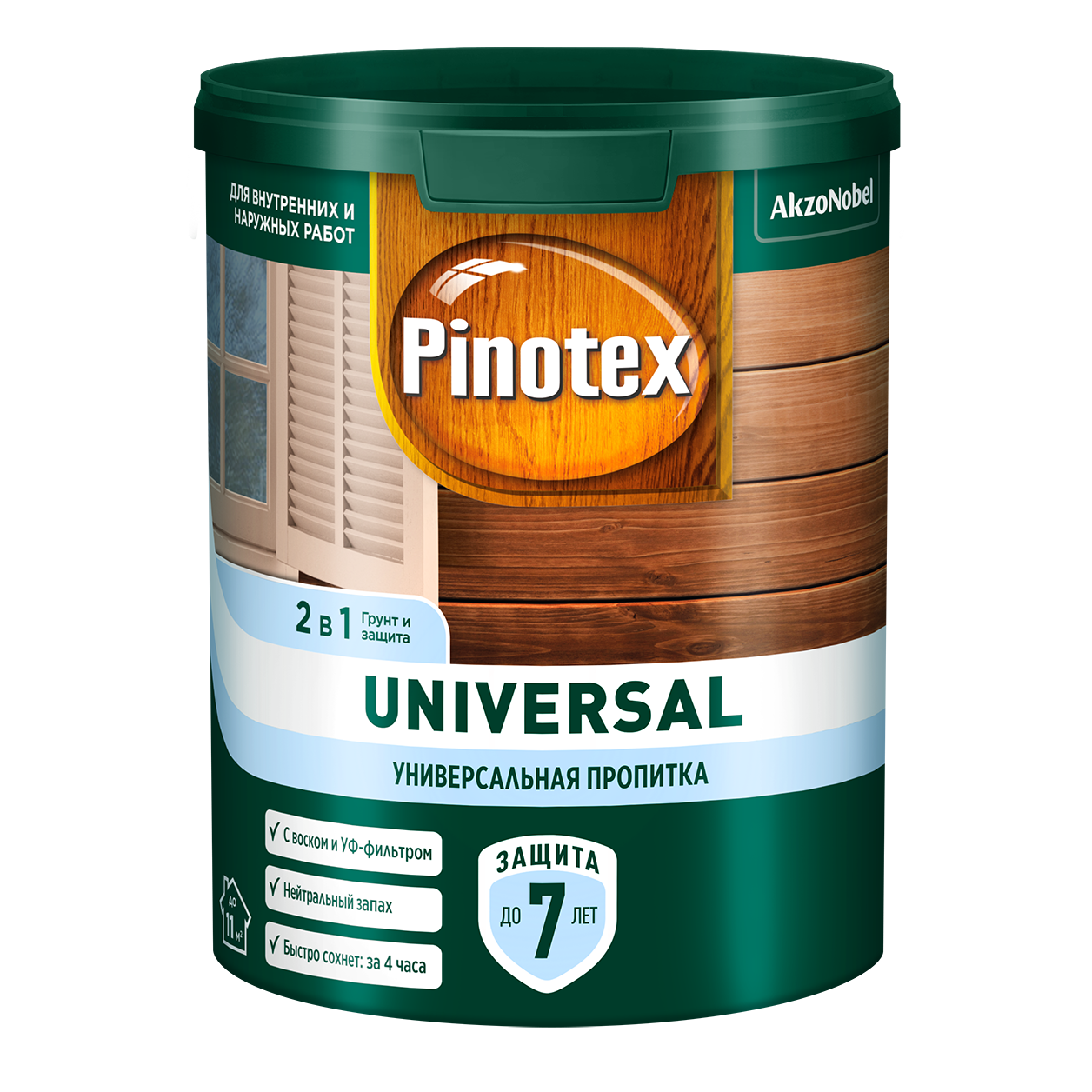 Пропитка для дерева Pinotex Universal используется как для наружных работ, так и безопасна для применения внутри помещений (универсальная), т.к. не содержит биоцидных добавок, не выделяет вредных веществ. Формула 2 в 1: наносится без грунта, питает и защищает от влаги и загрязнений, окрашенная поверхность устойчива к воздействию солнца, дождя, снега и мороза. Pinotex Universal легко наносится и быстро впитывается в поверхность древесины, образуя полуматовое покрытие. Подчеркивает естественную текстуру древесины.