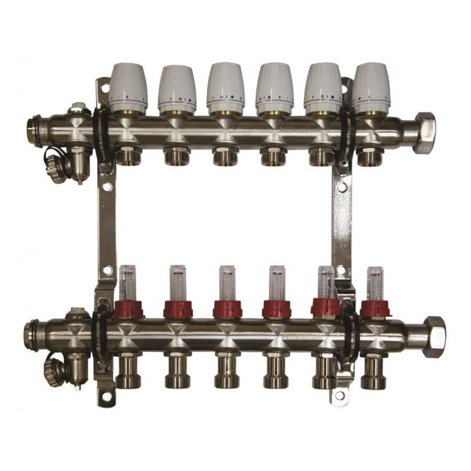 Коллекторная группа Millennium с расходомерами выполнена из нержавеющей стали, имеет регулировочные и термостатические вентили. Применяется при монтаже радиаторного отопления и теплых полов.