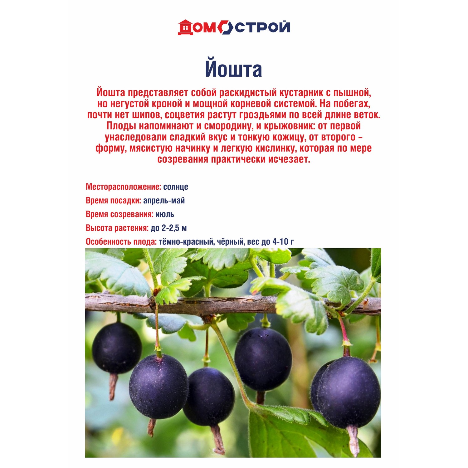 Йошта представляет собой раскидистый кустарник с пышной, но негустой кроной и мощной корневой системой. На побегах, почти нет шипов, соцветия растут гроздьями по всей длине веток.