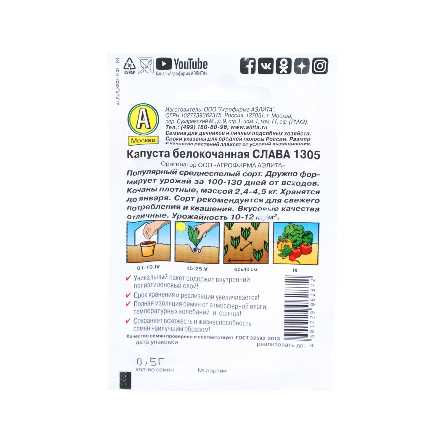 Семена Капуста б/к Слава 1305 0,5гр Аэлита Лидер автор *10/500