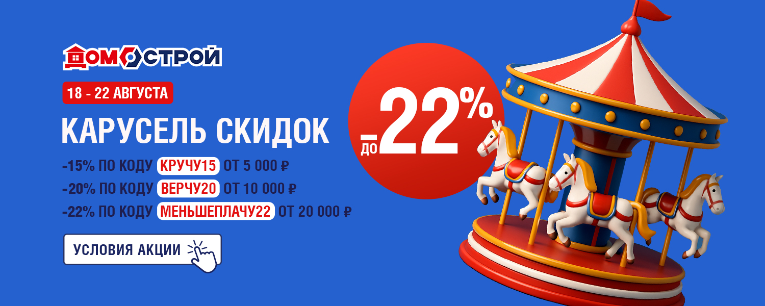 Только с 18 по 22 августа на сайте domostroy.shop запускаем Карусель скидок. Чем выше сумма покупки, тем сильнее раскручивается выгода: