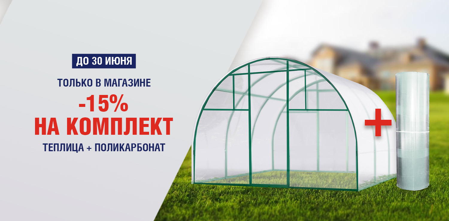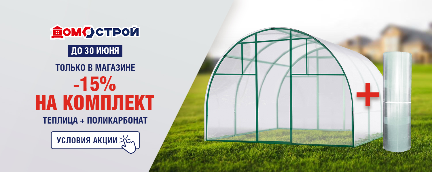 Только до 30 июня в магазине ДомоСтрой скидка -15% на покупку комплекта: каркас теплицы + поликарбонат. Цена действует только в розничном магазине.